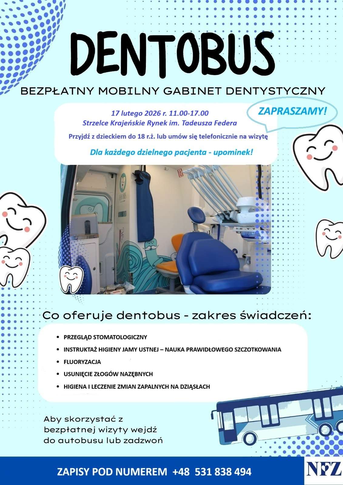 Informujemy, że 17 lutego 2026 r. do Strzelec Krajeńskich przyjedzie dentobus, w którym będą realizowane profilaktyczne świadczenia stomatologiczne finansowane przez NFZ.